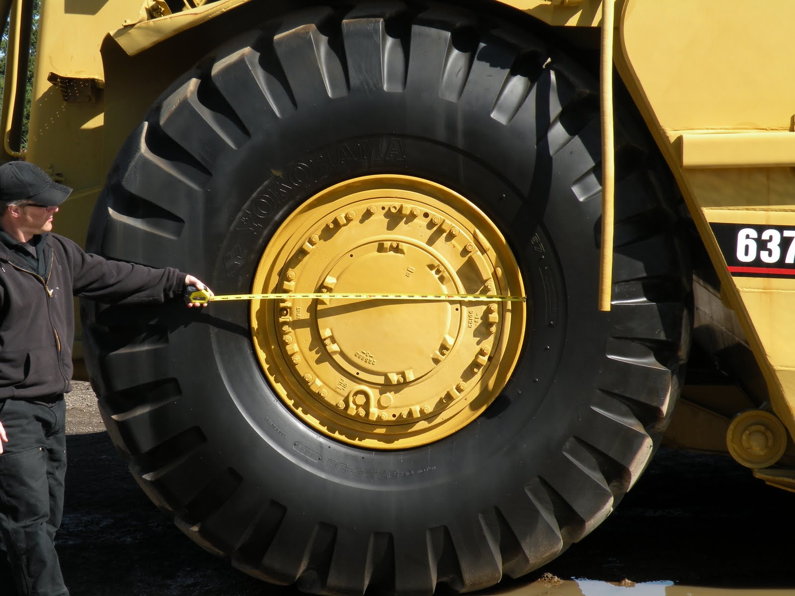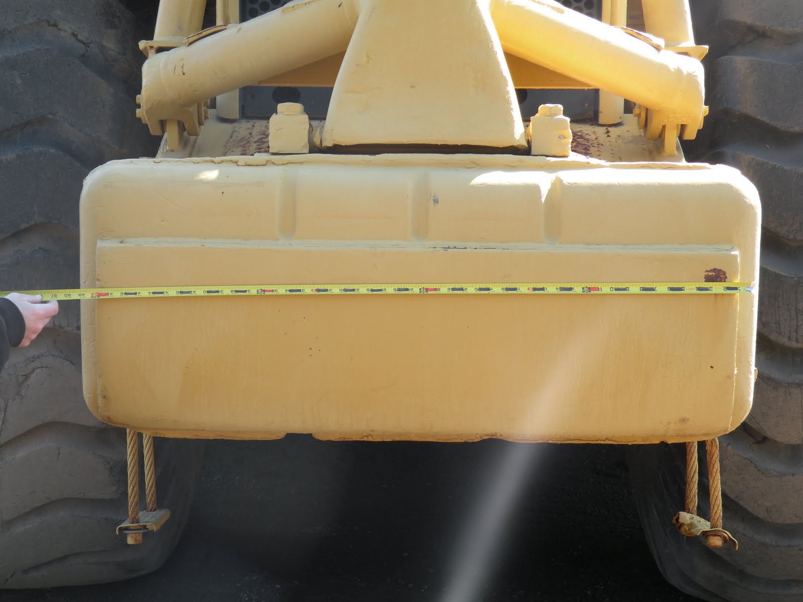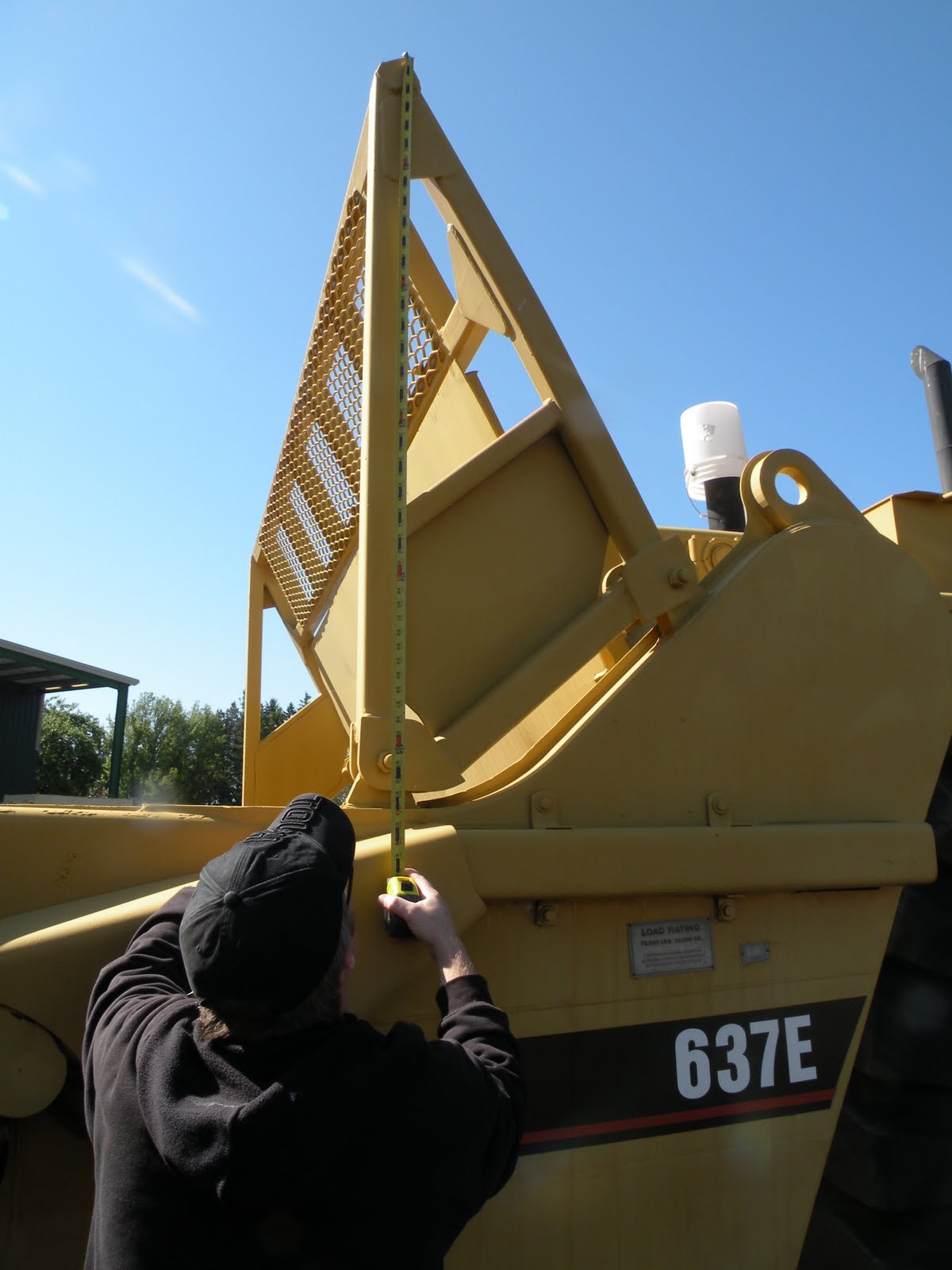 We start on the ground, walking around the machine and measuring the tires, grill, and anything else we can reach.